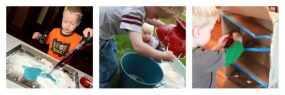This is bound to be a little messy, so prep your area a little bit if you mind. Playing with water is an all-time favorite in this house. Henry and George both could stand on a stool for hours (literally) at the kitchen sink, splashing, scooping, cleaning, or anything else they can come across. This time, I set up a couple separate tubs of water and dropped in a red and ...